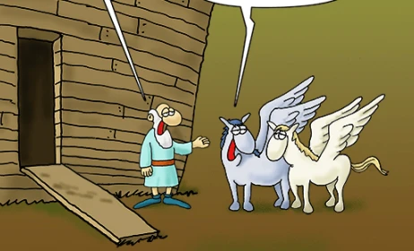 Ο σκιτσογράφος τον ζωγραφίζει και σήμερα επί τω έργω. Στην έκφραση του προσώπου του, αποτυπώνει με τα μελάνια του την υπομονή και την ψυχραιμία που χαρακτηρίζουν τον Νώε. Στη σημερινή εκδοχή της κιβωτού τον σκιτσάρει να μιλά με ένα ζευγάρι φτερωτών αλόγων, γνωστοί και ως πήγασοι.
