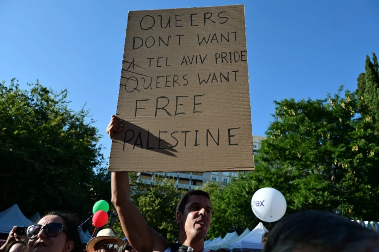 Η σφαγή στην Παλαιστίνη είχε τη δική της θέση στην πορεία υπερηφάνειας, με πανό, συνθήματα για “λευτεριά στην Παλαιστίνη” και το αίτημα για κατάπαυση του πυρός στη Γάζα.
