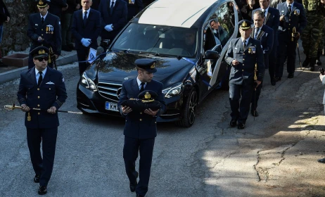 Ανείπωτος πόνος στο τελευταίο αντίο στον ήρωα πιλότο, αντιπτέραρχο Επαμεινώνδα Κωστέα, ο οποίος σκοτώθηκε όταν το αεροπλάνο του συνετρίβη κοντά στο αεροδρόμιο της Καλαμάτας, μπροστά στα μάτια της συζύγου και των παιδιών του.