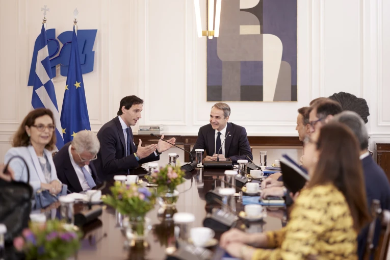 Ο Κυριάκος Μητσοτάκης υποδέχθηκε στο Μέγαρο Μαξίμου τον Ευρωπαίο επίτροπο για το κλίμα και την καθαρή ανάπτυξη Βόπκε Χούκστρα ο οποίος απέδωσε τα εύσημα στην κυβέρνηση για την πορεία της ελληνικής οικονομίας.