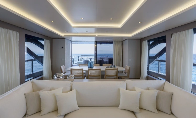 Στην πλώρη υπάρχει μια πισίνα με υδρομασάζ και χώρο ηλιοθεραπείας, με σαλόνι εξοπλισμένο με καναπέ και τραπέζι, η flybridge, 56τμ, μπορεί να διαμορφωθεί ανοιχτή ή κλειστή, με εσωτερικό σαλόνι τηλεόρασης. Το σαλόνι, στο κεντρικό κατάστρωμα, είναι μεγάλο και είναι φωτεινό από τα μεγάλα παράθυρα από το δάπεδο μέχρι την οροφή, δύο από τα οποία μπορούν να ανοίξουν για να προσφέρουν φυσικό αερισμό στο χώρο. Η πλατφόρμα της πρύμνης είναι επεκτεινόμενη. Το γκαράζ έχει επιφάνεια 28τμ και μπορεί να χωρέσει ένα tender 5,65 μέτρων και δύο jet ski.