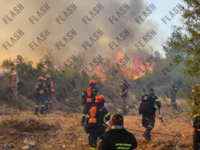 Οι πυροσβεστικές δυνάμεις προσπαθούν «με νύχια και με δ΄οντια» να μην φτάσουν οι φλόγες στα σπίτια.