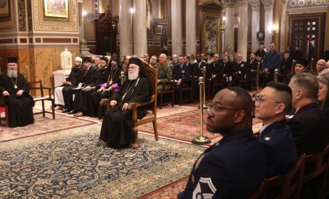 Όσοι έτυχε να ξεκουράζονται στα παγκάκια της πλατείας Μητροπόλεως το απόγευμα της Δευτέρας αντίκρισαν ένα σπάνιο θέαμα. Ένστολοι να προσέρχονται κατά ομάδες στον ολοφώτιστο καθεδρικό ναό.