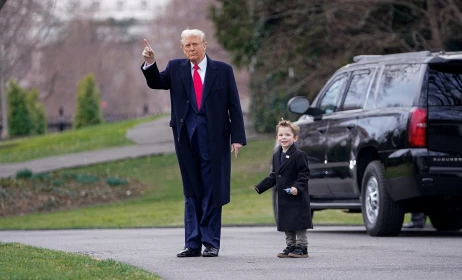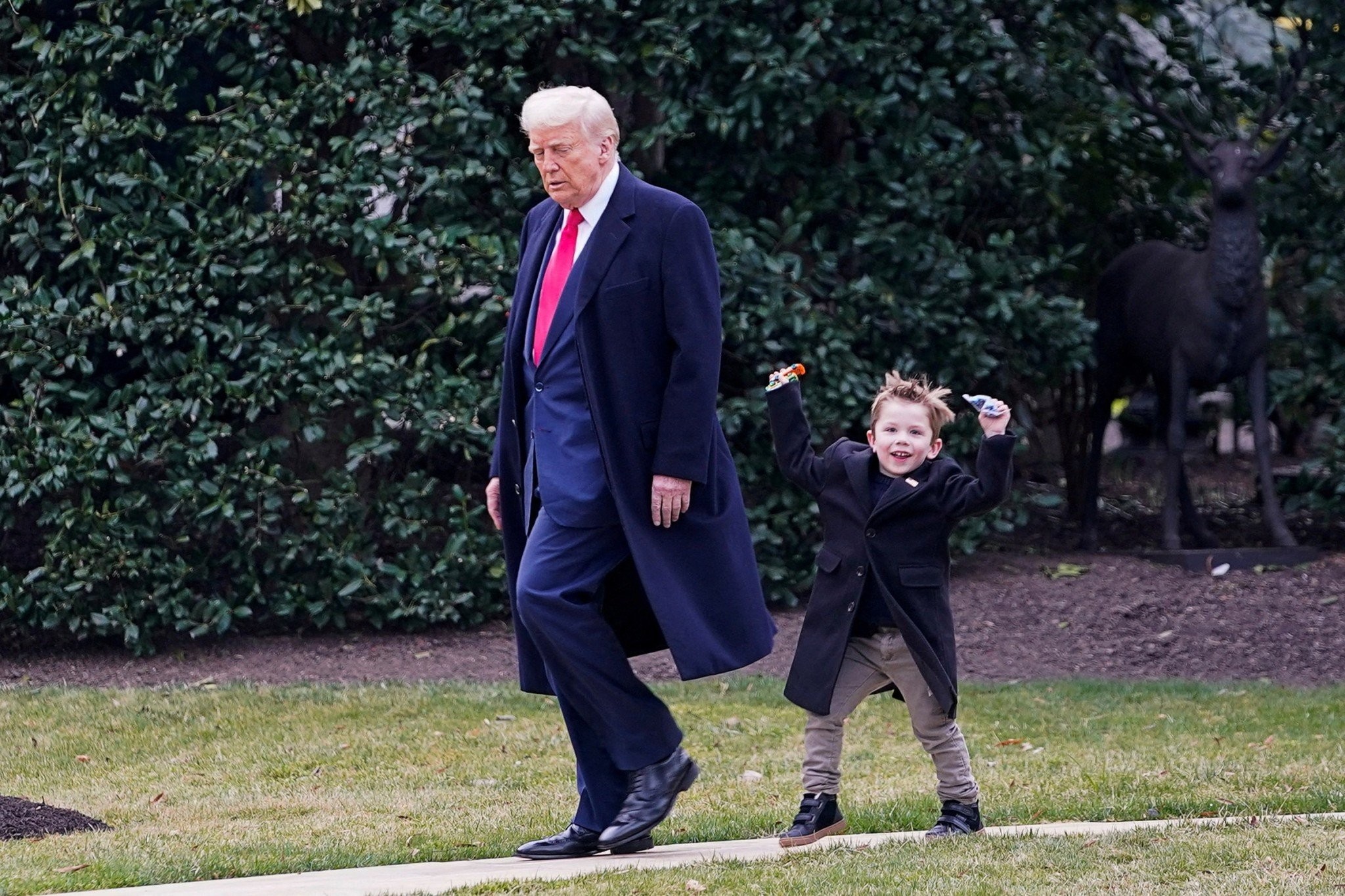 Ο Τραμπ εμφανίζεται με σκούρο μπλε κοστούμι, κόκκινη γραβάτα και μακρύ παλτό, ενώ ο μικρός X Æ A-Xii φορά σκούρο παλτό και μπεζ παντελόνι. Το παιδί φαίνεται ενθουσιασμένο, χοροπηδώντας και κρατώντας ένα παιχνίδι στα χέρια του.