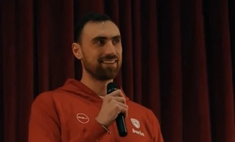 Στο πλαίσιο της καθιερωμένης «τελετής», ο σέντερ της ομάδας του Γιώργου Μπαρτζώκα, Νίκολα Μιλουτίνοφ απευθύνθηκε στα παιδιά των τμημάτων υποδομής του Ολυμπιακού, προκειμένου να τους συγχαρεί για την προσπάθειά τους.