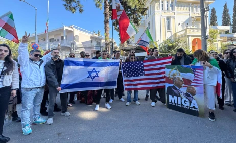 Περίπου 40 με 50 άτομα, ανάμεσα τους και η Ρέα Πεϊμάνη, συγκεντρώθηκαν έξω από την πρεσβεία του Ιράν στην Αθήνα. Φωνάζουν συνθήματα, τραγουδούν και κρατούν σημαίες του Ιράν, αλλά και του Ισραήλ και των ΗΠΑ, γιορτάζοντας τις τελευταίες εξελίξεις στη Μέση Ανατολή.