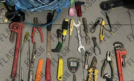 Κατά την προσπάθεια διαφυγής τους οι δράστες πέταξαν ένα κατσαβίδι κι ένα κοπίδι (σ.σ. τα συνέλλεξαν οι αστυνομικοί), ενώ εντός του κτιρίου βρέθηκαν δύο τσάντες - σακβουαγιάζ, όπου περιείχαν διαρρηκτικά εργαλεία, κομμένους χάλκινους σωλήνες και καλώδια (σ.σ. με χαλκό στο εσωτερικό τους).
