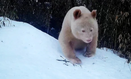 Κίνα: Το σπάνιο ζώο, μοναδικό στον κόσμο, φιλοξενείται στο Εθνικό Φυσικό Καταφύγιο Wolong στην επαρχία Σιτσουάν. Στο βίντεο που κυκλοφορεί στο διαδίκτυο το τεράστιο Πάντα - αλμπίνο αρχικά περιφέρεται μέσα στο δάσος μόνο του. Στη συνέχεια πλησιάζει μια άλλη ασπρόμαυρη μητέρα-πάντα με το μωρό της που ξεκουραζόταν σε ένα κοίλωμα δέντρου και προσπαθεί να αλληλεπιδράσει μαζί τους.