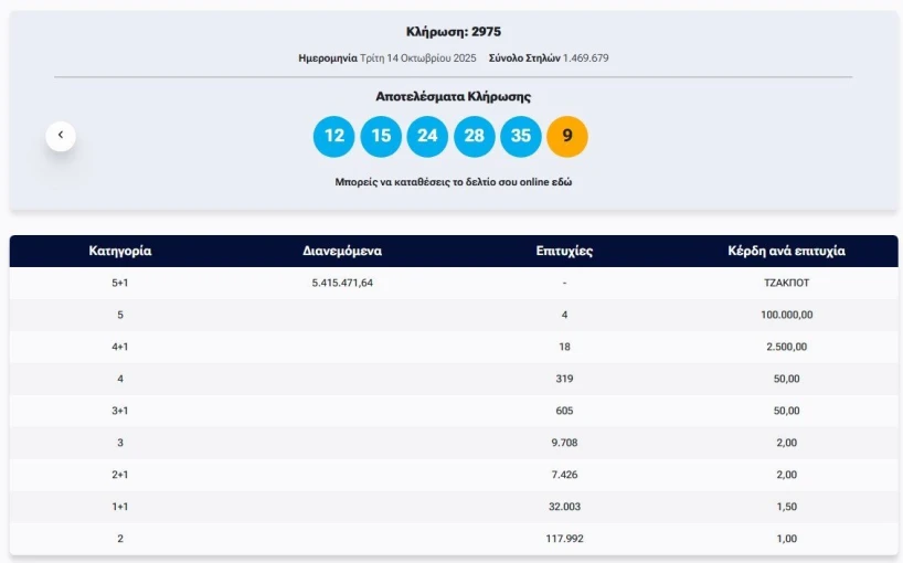 Πραγματοποιήθηκε το βράδυ της Τρίτης 14 Οκτωβρίου η κλήρωση 2975 του Τζόκερ, που μοιράζει στους τυχερούς της πρώτης κατηγορίας 5.415.471, 64 ευρώ.