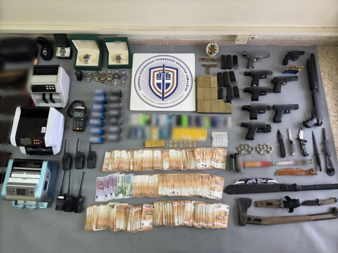 Κατά τις έρευνες των Εσωτερικών Υποθέσεων σε σπίτια και επιχειρήσεις, κατασχέθηκαν 410.000 ευρώ σε μετρητά, 16 χρυσές λίρες, μια πλάκα χρυσού, 11 πολυτελή ρολόγια, 2 πιστόλια, 1 περίστροφο, 1 κοντόκανη καραμπίνα, φυσίγγια κ.ά. αντικείμενα.