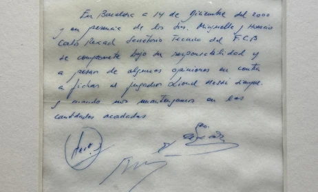 Στις 14 Δεκεμβρίου 2000, ο Λιονέλ Μέσι υπέγραψε το πρώτο του επαγγελματικό συμβόλαιο με τη Μπαρτσελόνα. Ένα συμβόλαιο όμως εντελώς διαφορετικά από όσα ακολούθησαν. Ένα συμβόλαιο που δεν αποτελείτο από αμέτρητες σελίδες με όρους που προβλέπουν τα πάντα γύρω από το όνομά του. Ήταν απλά μια χαρτοπετσέτα εστιατορίου, στην οποία υπέγραψε ο Αργεντίνος, ο τότε τεχνικός γραμματέας της Μπάρτσα Κάρλες Ρέσακ και ο Γιόσεφ Μαρία Μινγκέλα, ο ανιχνευτής ταλέντων που ανακάλυψε τον «Pulga».