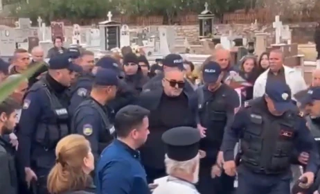 Στη συνέχεια και ενώ αστυνομικοί απωθούν όσους προσπαθούν να χαιρετίσουν τον Φρέντη Μπελέρη, ο εκλεγμένος δήμαρχος που κρατείται εδώ και μήνες στις αλβανικές φυλακές, πλησιάζει το φέρετρο με τη σορό της γιαγιάς του.