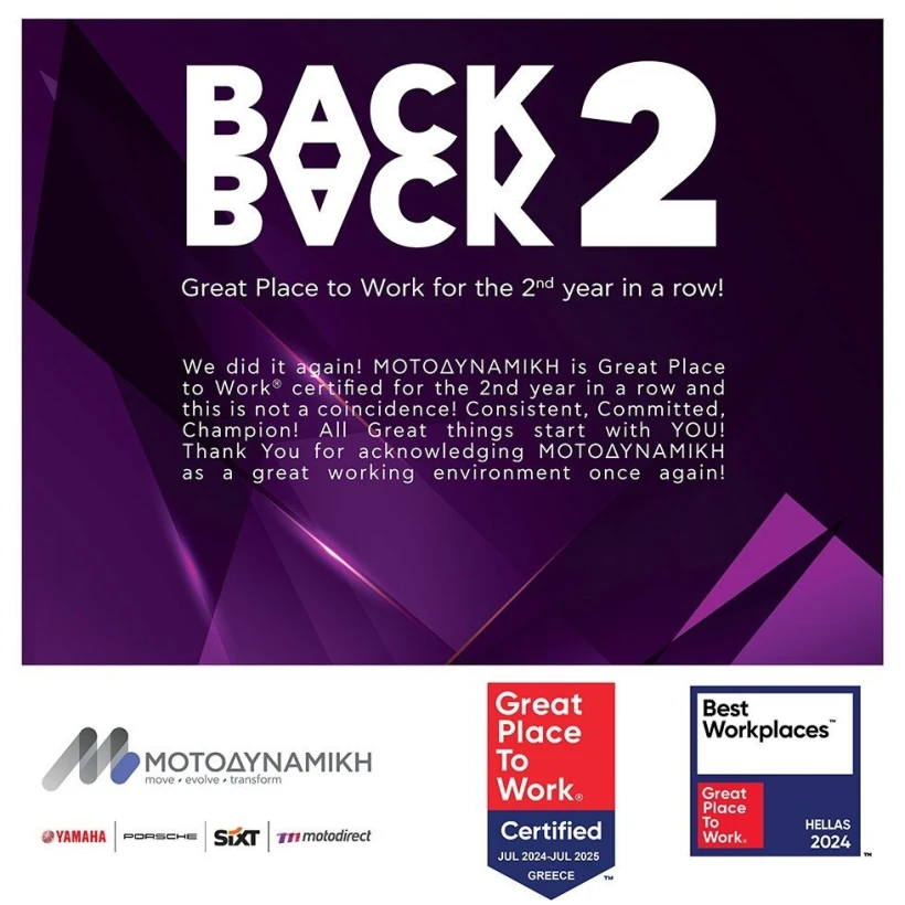 Με μεγάλη χαρά σας ανακοινώνουμε πως ο Όμιλος Μοτοδυναμική έλαβε για δεύτερη συνεχόμενη χρονιά την διεθνώς αναγνωρισμένη πιστοποίηση Great Place to Work. Αυτή η σημαντική διάκριση είναι αποτέλεσμα της αφοσίωσης και της προσπάθειας όλων των εργαζομένων μας για την δημιουργία ενός εξαιρετικού περιβάλλοντος εργασίας.