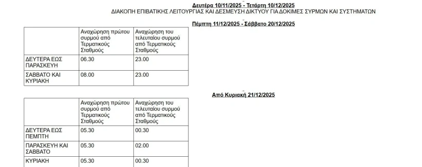 Για την ασφαλή ολοκλήρωση των δοκιμών συρμών και συστημάτων της επέκτασης προς Καλαμαριά, το Μετρό Θεσσαλονίκης θα παραμείνει εκτός επιβατικής λειτουργίας από τη Δευτέρα 10 Νοεμβρίου έως και την Τετάρτη 10 Δεκεμβρίου 2025. Κατά την περίοδο αυτή, καθώς και πριν και μετά από αυτήν, το πρόγραμμα των δρομολογίων του Μετρό θα τροποποιηθεί, όπως αναλυτικά παρουσιάζεται στους παρακάτω πίνακες, ώστε να διασφαλιστεί η ομαλή και απρόσκοπτη διεξαγωγή των δοκιμών του δικτύου προς την Καλαμαριά.