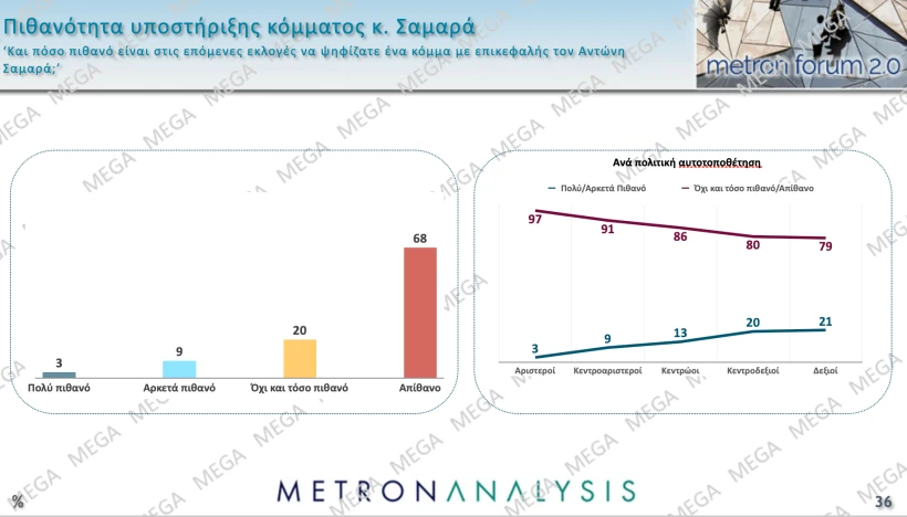 Αντίστοιχα στο ίδιο ερώτημα για το «κόμμα Σαμαρά» ποσοστό 68% λέει πως είναι απίθανο να στηρίξει ένα τέτοιο πολιτικό εγχείρημα.