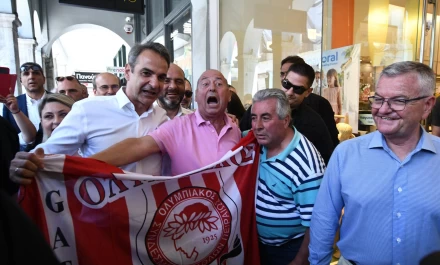 O κ. Μητσοτάκης έπεσε πάνω σε έναν θερμό οπαδό του Ολυμπιακού που έσπευσε να φωτογραφηθεί μαζί του: «Πες ότι ήμουν γουρλής και έπεσε σε όλα μέσα σε παρακαλώ...» είπε στον κάτοικο της Πάτρας ο Πρωθυπουργός.