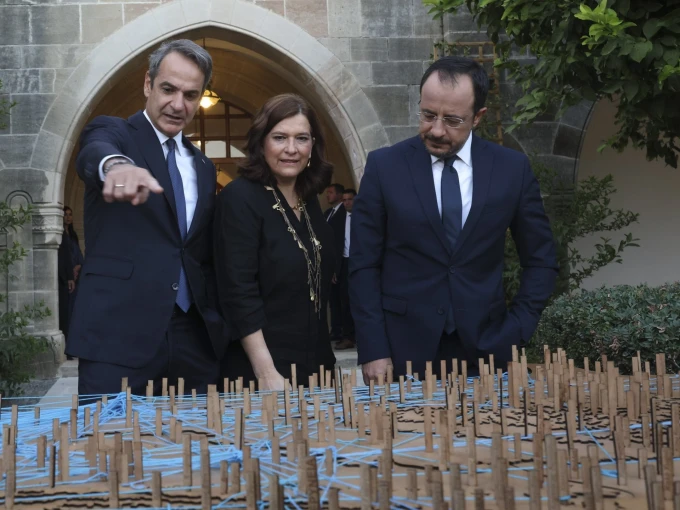 Στις οκτώ παρά τέταρτο, ο Κυριάκος Μητσοτάκης έφτασε στο Προεδρικό Μέγαρο της Κύπρου συνοδευόμενος από τη σύζυγό του. Ο Νίκος Χριστοδουλίδης τον υποδέχτηκε στην είσοδο του Προεδρικού και τον ξενάγησε στην έκθεση «Νήματα», που συμβολίζει την επέτειο των 50 χρόνων από την τουρκική εισβολή.