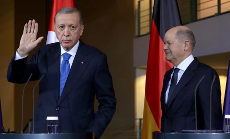 Σταθεροί στις θέσεις τους για την κρίση στη Μέση Ανατολή παρέμειναν τόσο ο Γερμανός καγκελάριος Όλαφ Σολτς όσο και ο πρόεδρος της Τουρκίας Ρετζέπ Ταγίπ Ερντογάν, κατά την εμφάνισή τους απόψε ενώπιον των εκπροσώπων του Τύπου, πριν από το δείπνο εργασίας τους στην καγκελαρία.