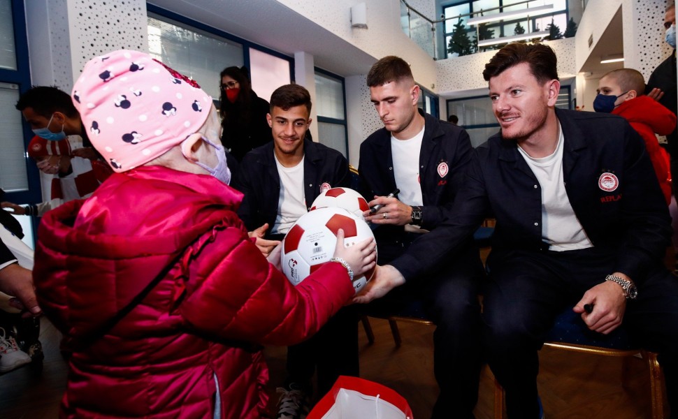 Οι ποδοσφαιριστές των «ερυθρολεύκων» Λορέντσο Πιρόλα, Τζουλιάν Μπιανκόν, Παναγιώτης Ρέτσος και Χαράλαμπος Κωστούλας πέρασαν χρόνο με τους αληθινούς μαχητές της ζωής και χάρισαν χαμόγελα, μοιράζοντας δώρα και βγάζοντας φωτογραφίες μαζί τους.