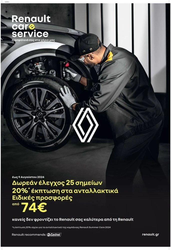 Από τις 3 Ιουλίου, μέχρι και την Παρασκευή 9 Αυγούστου, ελάτε σε ένα εξουσιοδοτημένο επισκευαστή Renault σε όλη την Ελλάδα και εξασφαλίστε δωρεάν τεχνικό έλεγχο 25 σημείων, 20% έκπτωση στα ανταλλακτικά της καμπάνιας Renault Summer Care, καθώς και ειδικές προσφορές σε πακέτα συντήρησης και επισκευής από 74€, τα οποία αφορούν αυτοκίνητα Renault όλων των ηλικιών και περιλαμβάνουν γνήσια ανταλλακτικά, εργασία και ΦΠΑ.