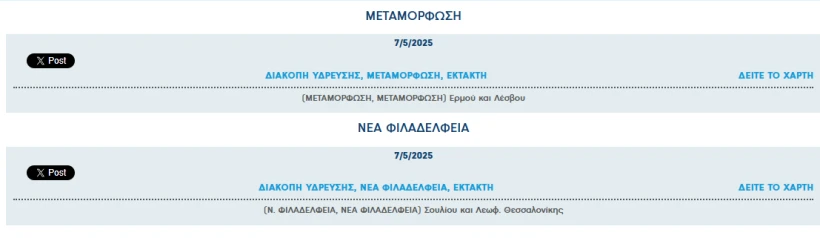 Οι περιοχές όπου θα πραγματοποιηθούν οι διακοπές υδροδότησης είναι οι εξής: