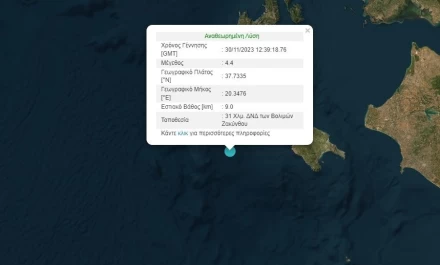 Σεισμός μεγέθους 4,4 βαθμών της κλίμακας Ρίχτερ καταγράφτηκε σήμερα Πέμπτη (30/11), στη θαλάσσια περιοχή ανοιχτά της Ζακύνθου.