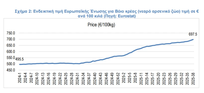 Σε σχέση με τις αυξήσεις στα φρέσκα κρέατα πρόκειται για εξέλιξη η οποία οφείλεται πρώτον στις αυξήσεις των διεθνών τιμών στα εισαγόμενα είδη και ειδικά στο μοσχάρι λόγω της μείωσης του ζωικού κεφαλαίου (σημειώνεται ότι η πλειοψηφία του μοσχαριού και χοιρινού που καταναλώνεται στην Ελλάδα είναι εισαγωγής) και δεύτερον στις ασθένειες ζώων που έπληξαν πολλές περιοχές εκτροφής στην Ελλάδα και ειδικά τα αμνοερίφια. Όπως φαίνεται στο σχήμα την εβδομάδα 38 του 2025 (15-21 Αυγούστου) η τιμή παραγωγού του Βοείου Κρέατος για νεαρό αρσενικό ζώο στην Ευρωπαϊκή Ένωση έχει αυξηθεί κατά 35,4% σε σχέση με την ίδια εβδομάδα το 2024 και 23,5% σε σχέση με την αρχή του 2025, ενώ η τάση παραμένει αυξητική.