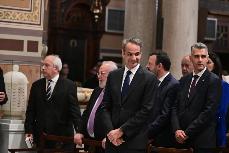 Μόλις εισήλθε στον ναό, ο κ. Μητσοτάκης κατευθύνθηκε προς τις θέσεις των επισήμων. Εκεί τον περίμενε ο Αρχιεπίσκοπος Ιερώνυμος με τον οποίο χαιρετήθηκαν δια χειραψίας.