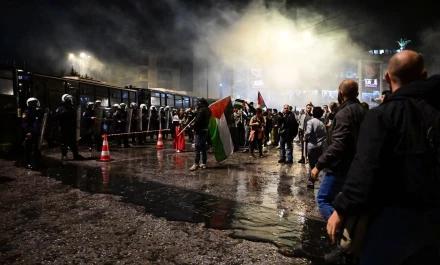 Το βράδυ, η πορεία έφτασε μπροστά στην ισραηλινή πρεσβεία στην Αθήνα, όπου είχαν παραταχθεί από νωρίς ισχυρές αστυνομικές δυνάμεις καθώς και κλούβες των ΜΑΤ.