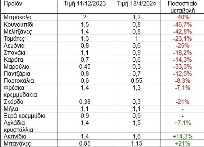 Από τη σύγκριση των τιμών στις 18 Απριλίου 2024 και στις 11 Δεκεμβρίου 2023, σε 40 βασικά φρούτα και λαχανικά διαπιστώνονται: