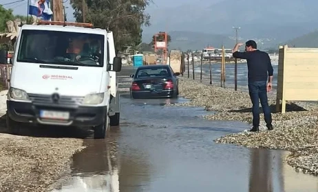 Η έντονη θαλασσοταραχή μετέτρεψε τον παραλιακό χωματόδρομο σε παγίδα για τους οδηγούς.
