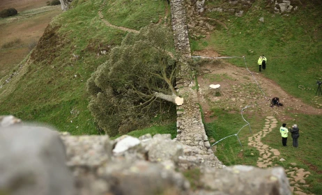 Το Sycamore Gap, ένας ψευδοπλάτανος ηλικίας 200 ετών, δέσποζε δίπλα στο τείχος του Αδριανού, απομονωμένο ανάμεσα σε δύο λόφους σε ένα εντυπωσιακό τοπίο του εθνικού πάρκου Northumberland, στη βόρεια Αγγλία.